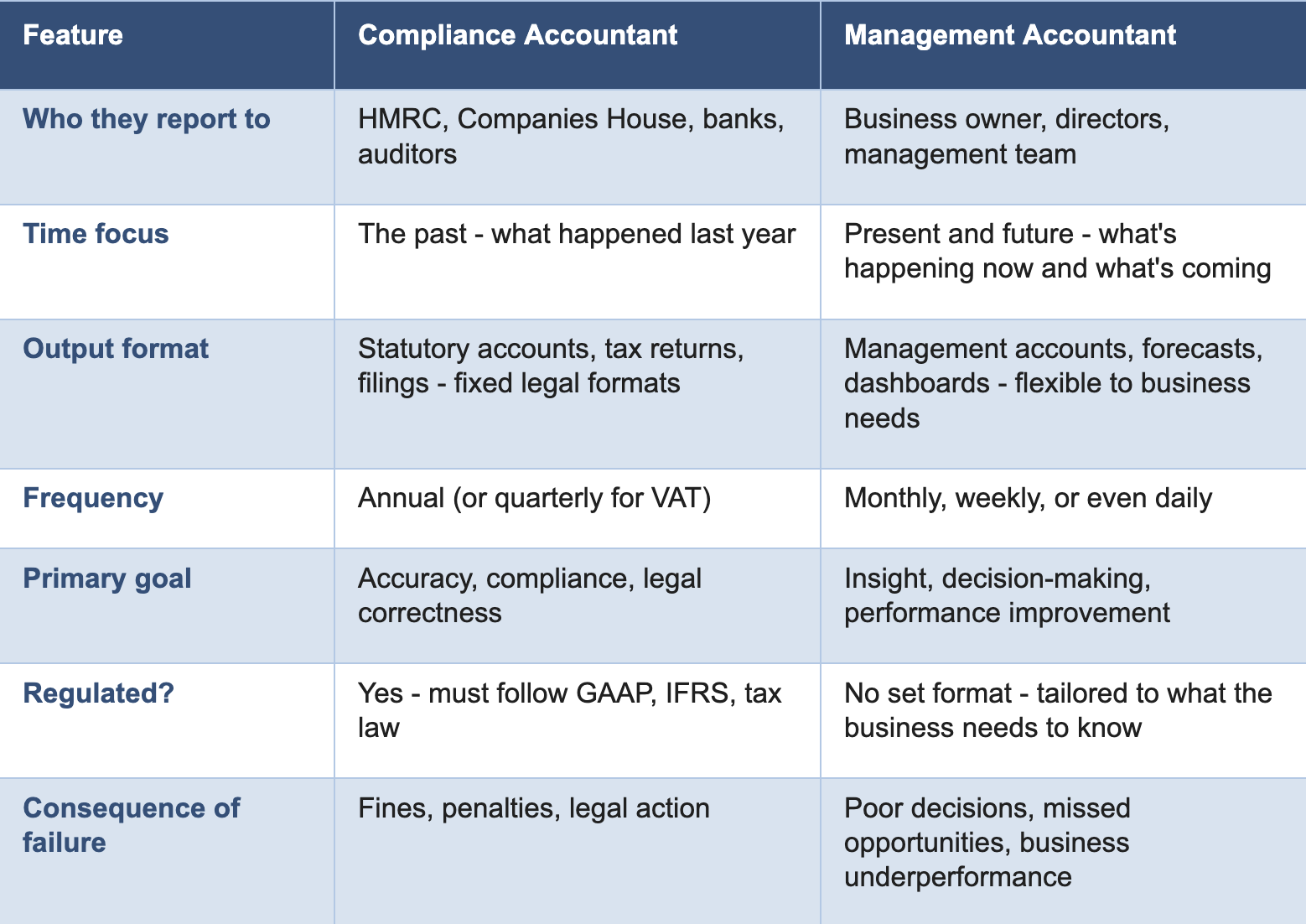 The compliance accountant ensures the business is legally sound, tax-efficient, and trusted by external stakeholders. The management accountant ensures the business is making smart decisions, understanding its own performance with good record keeping and reporting, and heading in the right direction.