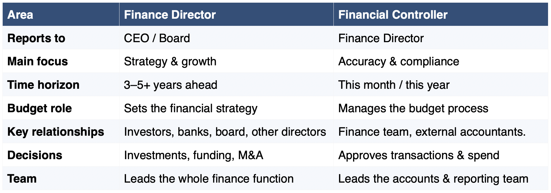 The Financial Controller makes sure everything that’s already happened is properly recorded, reported, and in order. They’re not setting strategy. They’re making sure the foundations are solid. Think of them as the person who keeps the engine running cleanly, so the Finance Director has reliable numbers to work with.Overseeing the business finance team and ensuring accurate record keeping and processes.